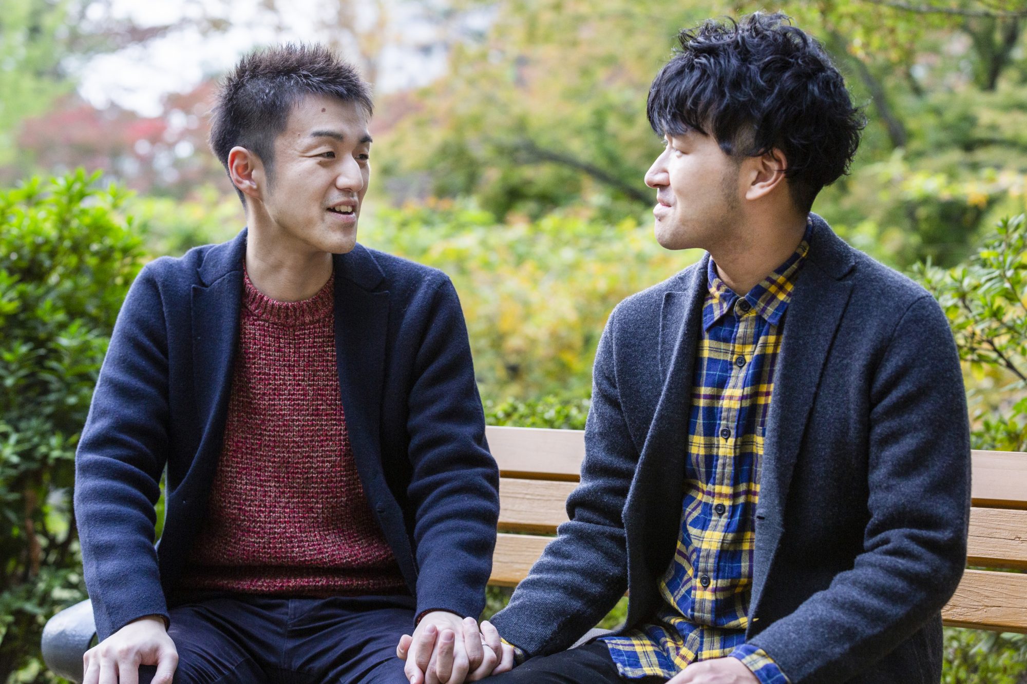にこにことほがらかに話すのが赤いコンバースのまさひろさん(32)で、落ち着いた口調で穏やかに話すのが紺のコンバースのこうすけさん(30)。